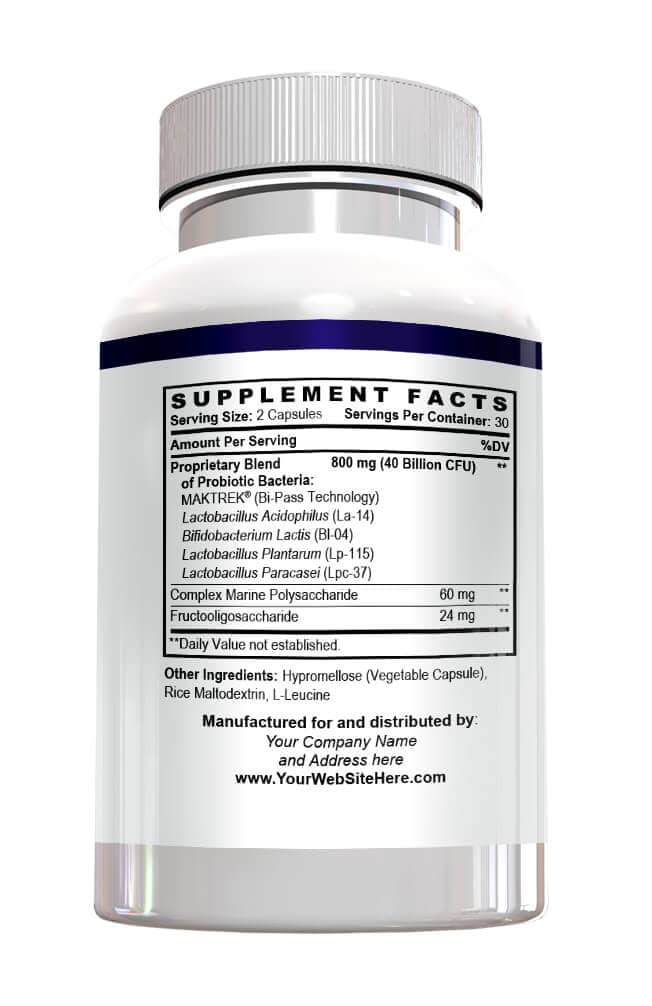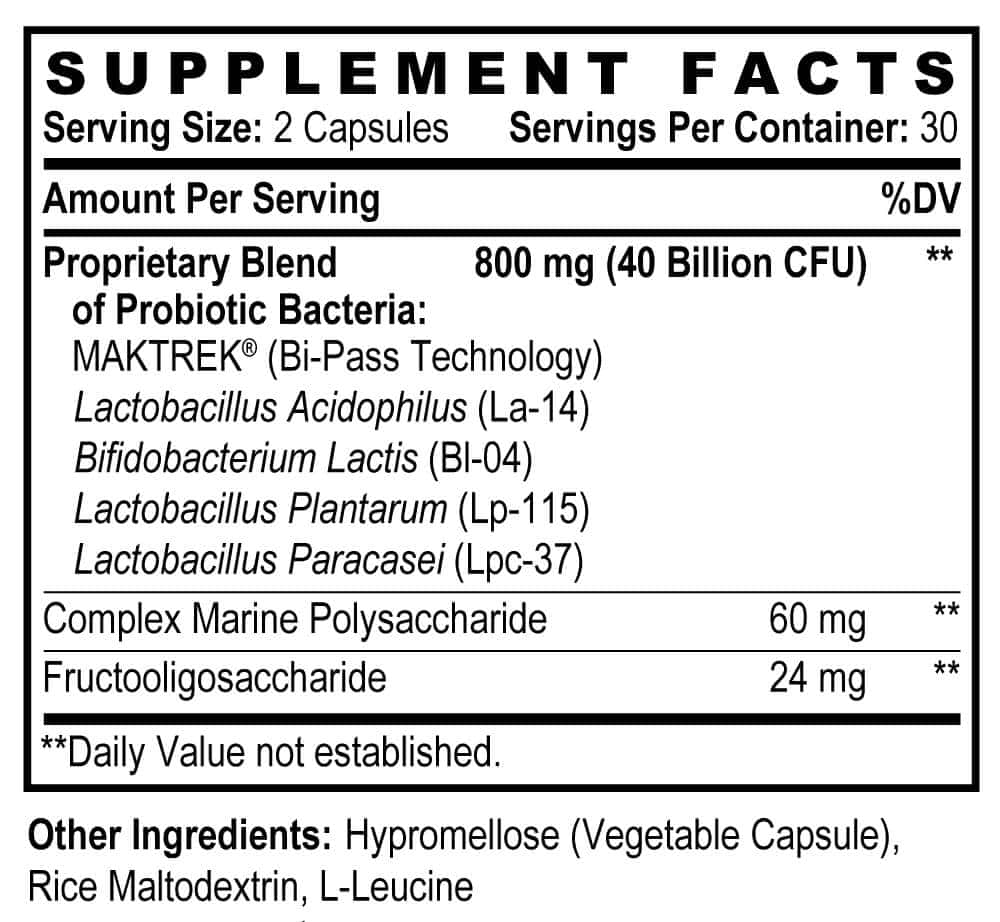 Containing a blend of 4 strains of probiotic bacteria, our Probiotic Formula provides 40 billion healthy organisms to support and improve a healthy gut and intestinal flora. With added FOS or fructo-oligosaccharides for to aid in the growth of healthy organisms such as acidophilus and bifidobacterium.